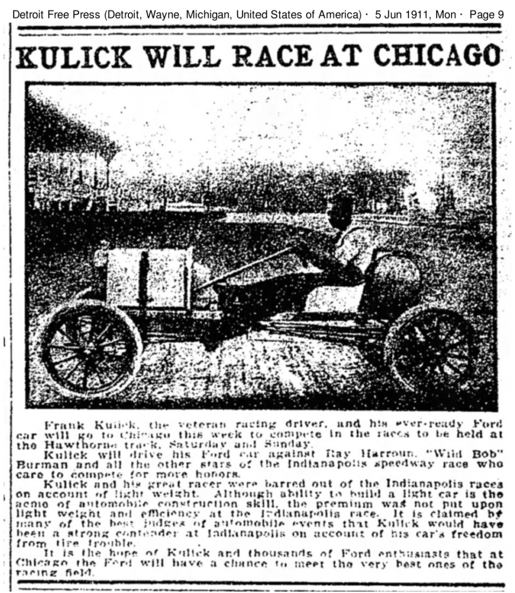 This also provided Joe Galamb and Henry Ford the chance to demonstrate to the world the abilities of their smaller racers, the 300 cubic inch and 230 cubic inch Ford Specials, that also won five mile races that afternoon, all driven by Frank Kulick: