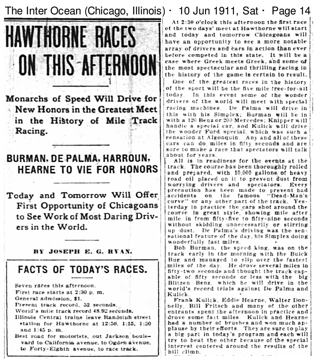 This also provided Joe Galamb and Henry Ford the chance to demonstrate to the world the abilities of their smaller racers, the 300 cubic inch and 230 cubic inch Ford Specials, that also won five mile races that afternoon, all driven by Frank Kulick: