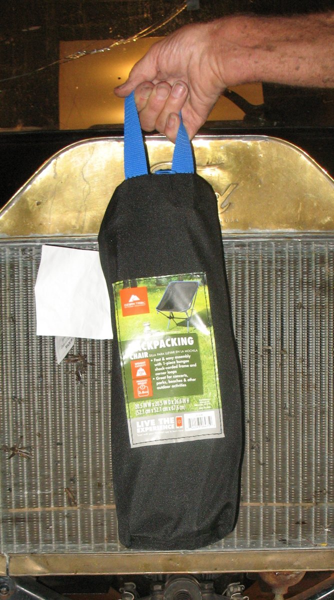 The chair makes a package a little under 16" long, easy to stash on the running board or in the trunk. They make a chair that sells for less than half the price, but it makes a much less compact package, three feet long.