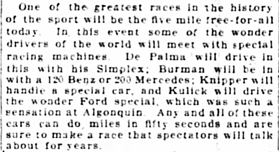 This also provided Joe Galamb and Henry Ford the chance to demonstrate to the world the abilities of their smaller racers, the 300 cubic inch and 230 cubic inch Ford Specials, that also won five mile races that afternoon, all driven by Frank Kulick: