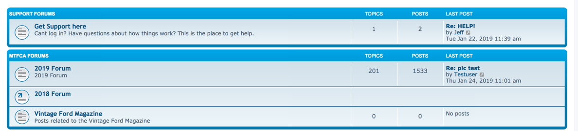 Thank you Jeff for all the work you are doing for the forum. I think more organization to the forum as you suggest is a great idea! A dedicated (Support Forum) an OT (Off Topic) Forum and even an (Old Photo) Forum would be great! I think having the technical questions and general Model T discussion separated from other topics will help the forum grow. A small percent of the current 1,400+ registered users participate on the forum. With a little organization I think more would join in.AdminJeff wrote: ↑Thu Jan 24, 2019 10:17 pmWe're looking at a minor reorg of the topics, perhaps a dedicated Support Forum where folks (even guests can post if you cant log in) can ask for help and it keeps the clutter off the main Forum. Possibly even a dedicated OT (Off Topic) Forum.
