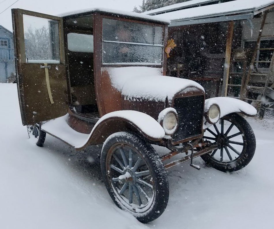 The Coupe wouldn't start yesterday after a 2°night and 11°. About 10° warmer this morning the accumulated gases in the combustion chamber from yesterday fired right off and we got off to breakfast and back before they advised no travel in Idaho Falls unless absolutely necessary. There are 3 foot drifts in the backyard where I usually park the T but a spot out front has minimal snow so I will keep it there for a while. The 25mph wind keeps the snow off the car.