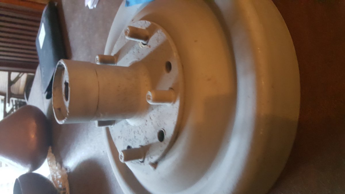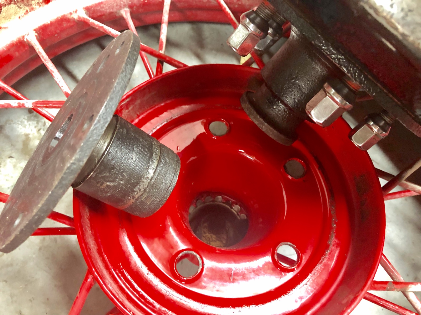 As Les posted, at least he put the sleeve over to increase the diameter of the hub to help secure it to a wire wheel. The T wire wheel has a tapered snout to provide lateral thrust when rounding corners. The front and rear T wire wheel hubs mate with the T wire wheel snout in that manner. 'Bout the only way to pull that modified rear hub now is with a knock off.
