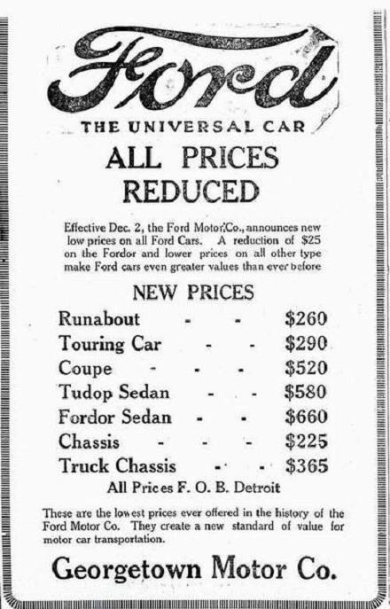Another thing to consider - excepting those within walking distance of the factory, no one would have been able to buy one for that F.O.B. price. Transportation, dealer "prep" (some assembly required ?) local taxes (possibly) and registration fees would bring the buyer's out-of-pocket to around $300. and more in most cases.