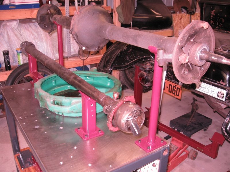 All-in-all, it is a nice compact set-up that is solid and stable, yet easy enough to move around, even with the axle on the table. After you are done using it for rear axle work it can be used as a solid work table or workbench or move out of the way. It does need a small tweak or two, but nothing major. For it's first trial run it worked extremely well and made the job easier than I ever remember. That 3 hour and 28 minute time for an axle overhaul in the Ford Manual may be in reach. I will post some other photos of it in use.