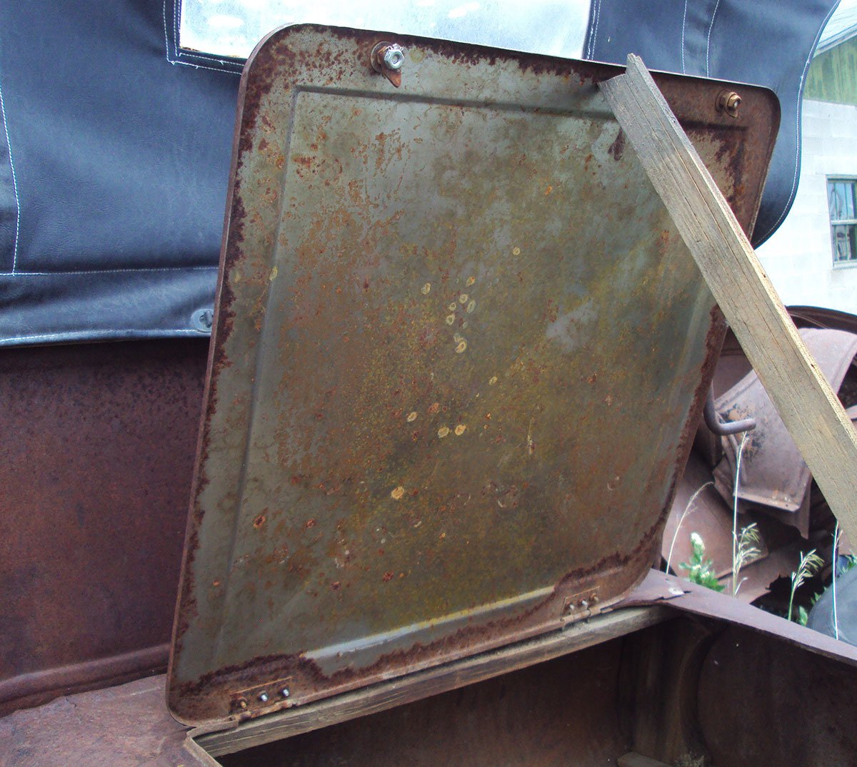 This turtle deck lid I made for a deck that was torn and flattened. It was for my first "Rusty" build and didn't have to be perfect. I bent the edge around a piece of particleboard. It took the outside some time to match the rest of the car but the inside has only rusted as shown in 20 some years and sitting outdoors. (Idaho) The handle was a flattened bolt shank and still has some zinc on it. What reminded me of this was remembering a ruined, rusty splash apron I sacrificed to make the missing piece in the deck. It is shown at top of the first photo with a new bead rolled into it. Then it was simply screwed into place.