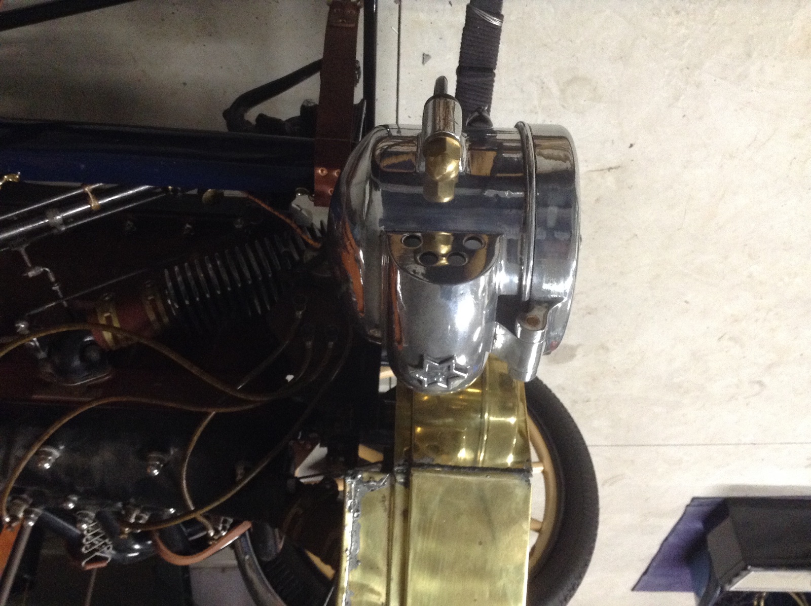 Front end coming together head lamps installed. Bought these off e bay from a vender in Quebec because they were aluminum ,which goes with the aluminum cycle fenders and hub caps etc.when they arrived there was AL cast into the top a quick Google search and these lamps are from a 1907 AL car built in France.