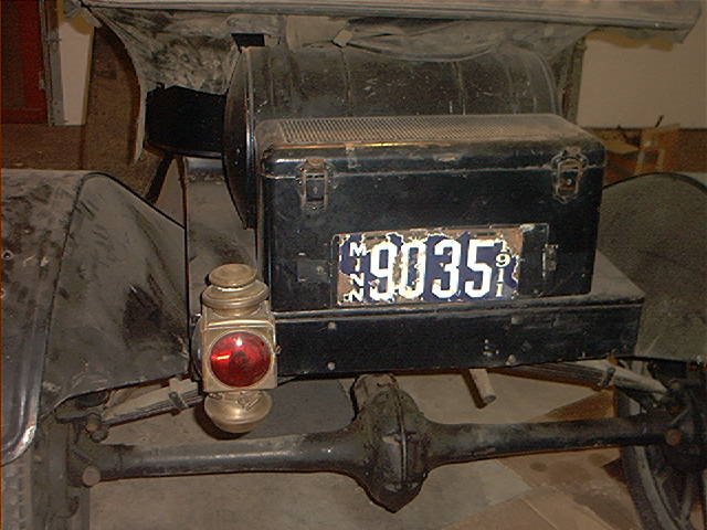 Hi, it is a 1914 coil box which will be changed in time. It is just sitting there unattached, makes it look a little more slanted. It also came with later black headlights, not installed. If you look close you might see some nickel hubcaps. I have only owned it a few hours and have not had time to make everything correct yet, the most noticeable things like the headlights and horn I want to get done first. I think the guy that owned it was looking for the parts but he died 40 years ago. I feel lucky just to get it. Thanks, Bob.