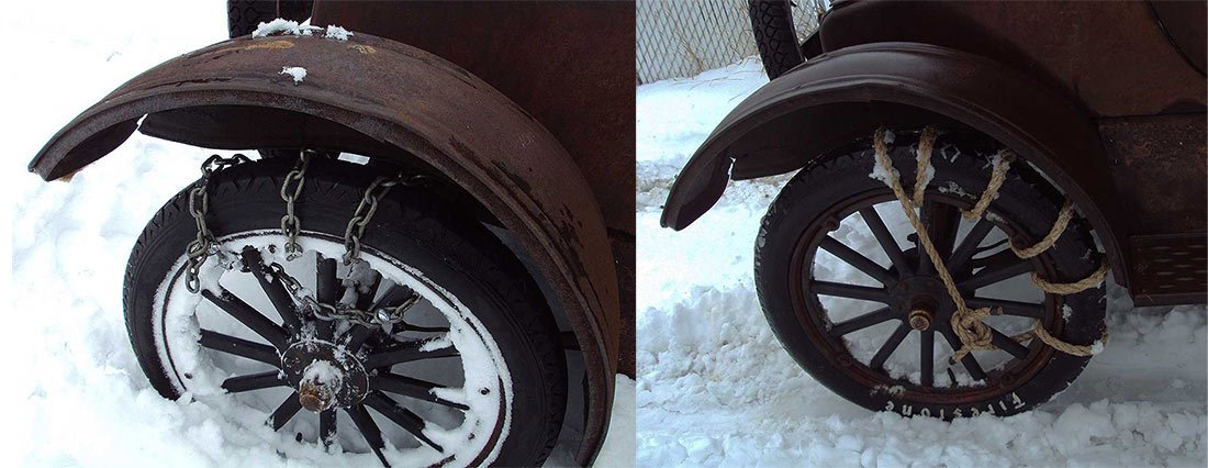 I made my chains from discarded modern tire chains aboit 15 years ago... Work great. If the snow comes I will pst chain photos