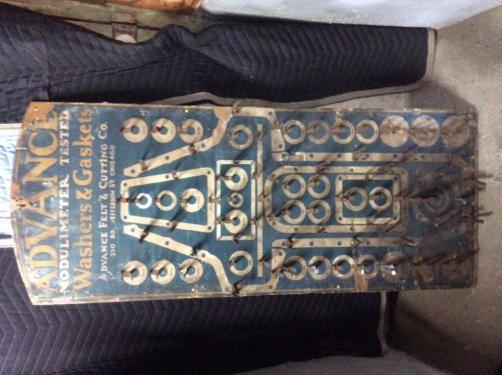A shout out to brother Dave Hanlon and his daddy for saving this piece. He sold it to me nearly 2 years ago, practically gave it to me because it was in shreds, and actually in two pieces. The fact is, they saved it until I brought it home for some TLC. It’s made of some sort of very early homesote , with a rag paper artwork and bare steel hangers. It wasn’t meant to survive a decade but it did. It has survived a hundred years now. I don’t really want to think of the hours I wasted but finally able to hang and fill up with old gaskets. Another shoutout to Larry Gresh, Joe Bell, and again, Dave Hanlon for providing me with lots of worn out and shrunk gaskets, perfect for display. Thought I would share.