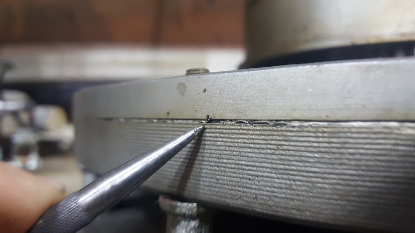 Also, the ring does protrude from the o.d. of the iron flywheel about 0.003 to 0.005 all around. That said, I started going around it really close and now see something that I didn't notice before -- sections where there looks to be a rolled burr on the flywheel side of the ring. In the attached I picked out a piece and am pointing at it so you can see it better.