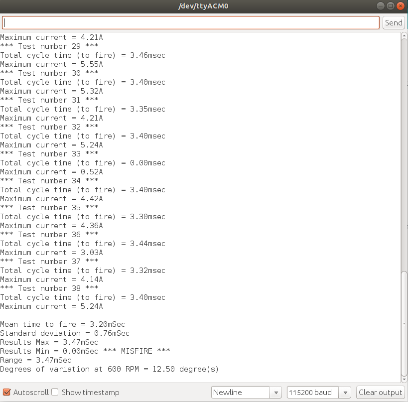 Luke's results are interesting, I like that format of data presentation and the info is useful. If the variation of crank angle at time of fire @ 600 is based on the range, it overstates the' problem'. Consistency is the goal in coil adjustment, but the consistency based on mean and sdev is a better way to quantify it. I suspect the values are correct, and based on the range of firing times the range of crank angle variation is 1.24 degrees@600rpm. Relative to the mean it is 0.00 (-0.57/+0.67 degrees) maximum +/- variation. These maximum variations occur in the spectrum of firings reported by your device, and based on the sdev or 0.07 mS (0.24 degrees) most events produce smaller variations.
