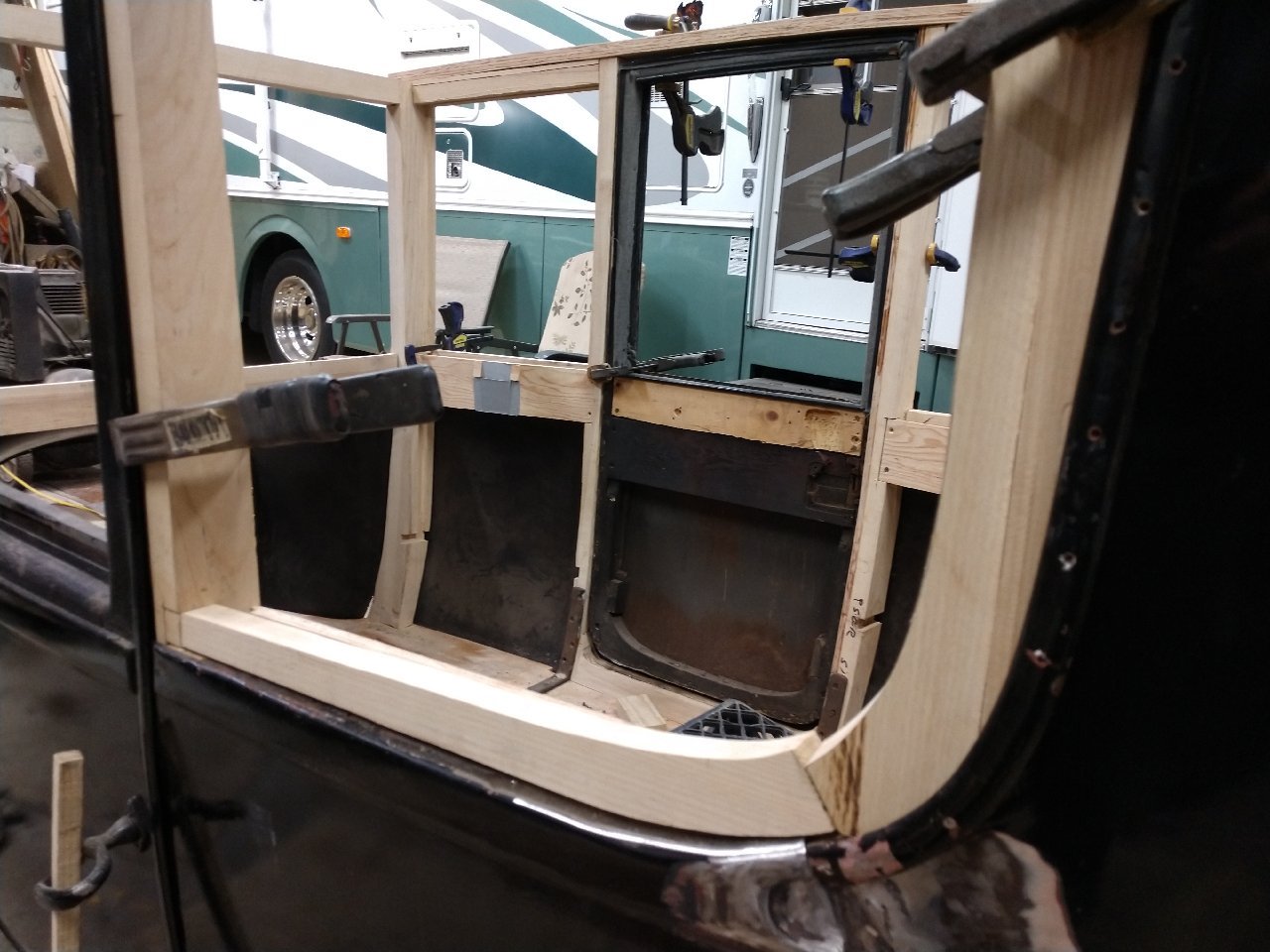 Ok looking at Johns last picture of the C-door, note the rear window swoop. This is what I am attempting to duplicate this morning. Opinions welcome, do you think I have the general idea? Still nothing is fastened or trued up. It also needs to be quarter round yet.