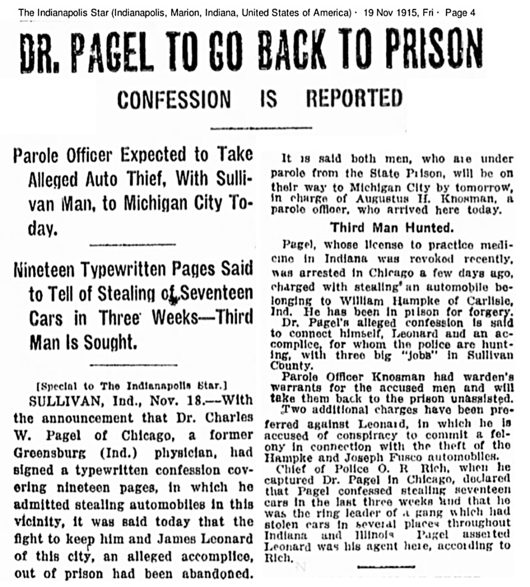 In November of 1913 our good doctor is charged with forgery, involved in a scheme to steal a farm. He's convicted and sent to prison in February, 1914. It doesn't look good for Dr. Pagel: