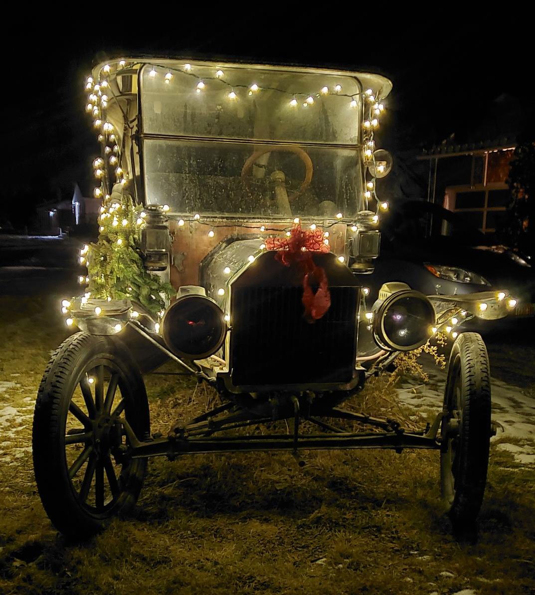 Started decorating for Christmas today. It’s snowing like crazy. Our tiny unheated garage and the T snuggled inside got the treatment too.