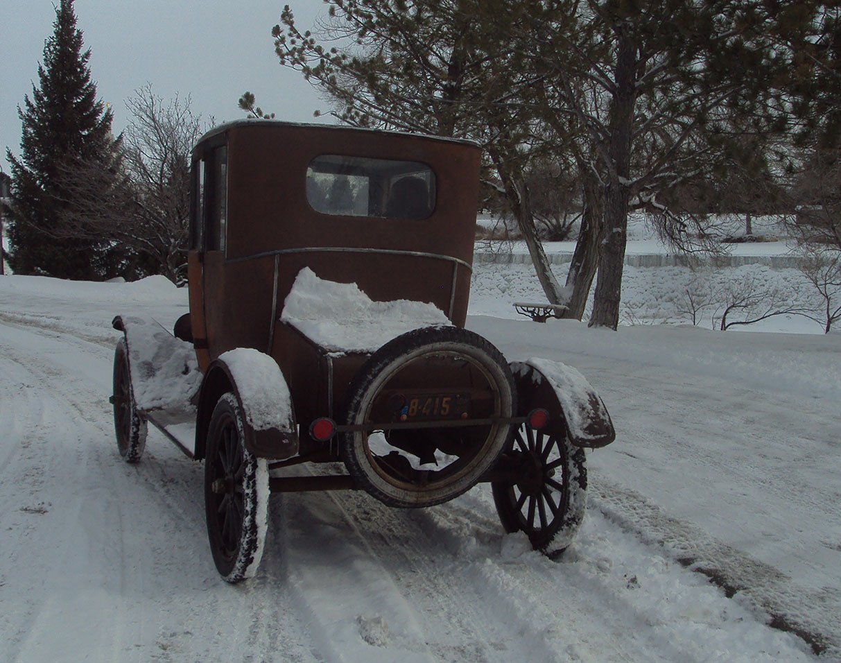 The Coupe wouldn't start yesterday after a 2°night and 11°. About 10° warmer this morning the accumulated gases in the combustion chamber from yesterday fired right off and we got off to breakfast and back before they advised no travel in Idaho Falls unless absolutely necessary. There are 3 foot drifts in the backyard where I usually park the T but a spot out front has minimal snow so I will keep it there for a while. The 25mph wind keeps the snow off the car.