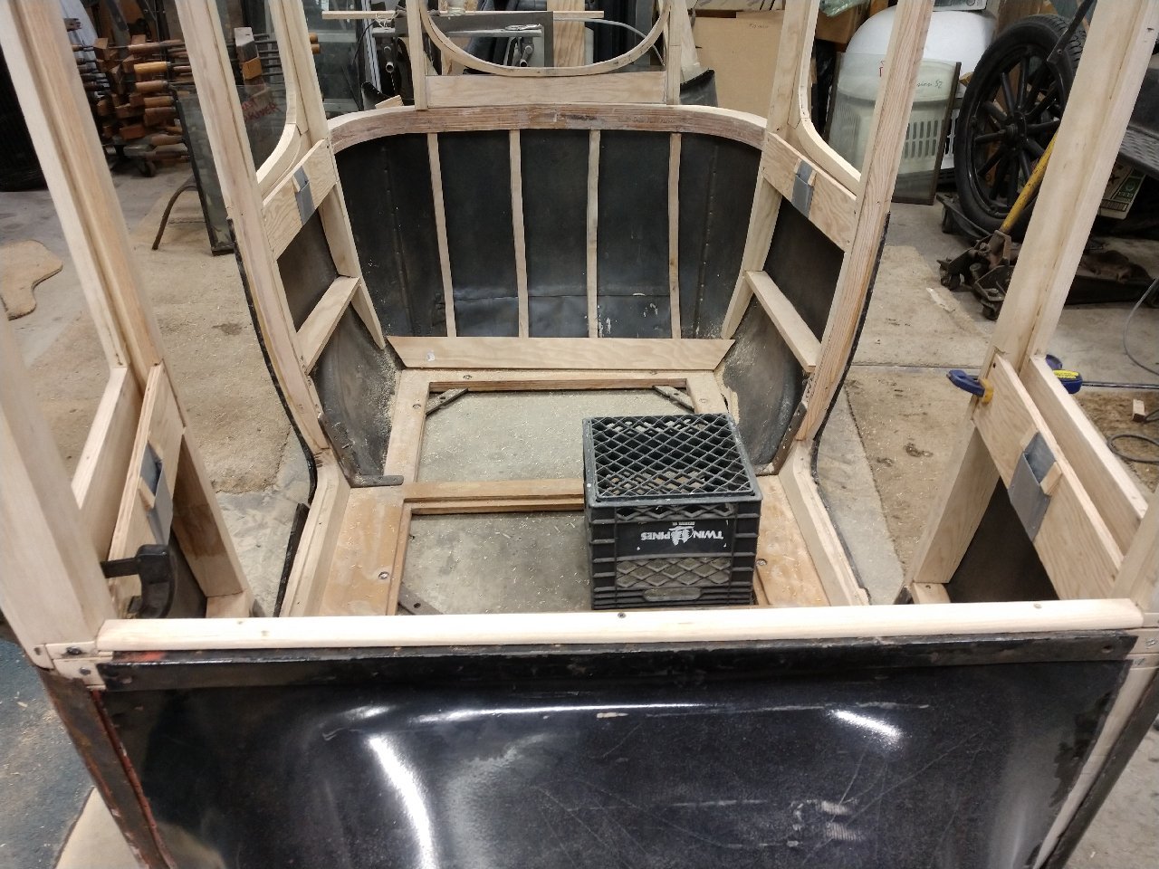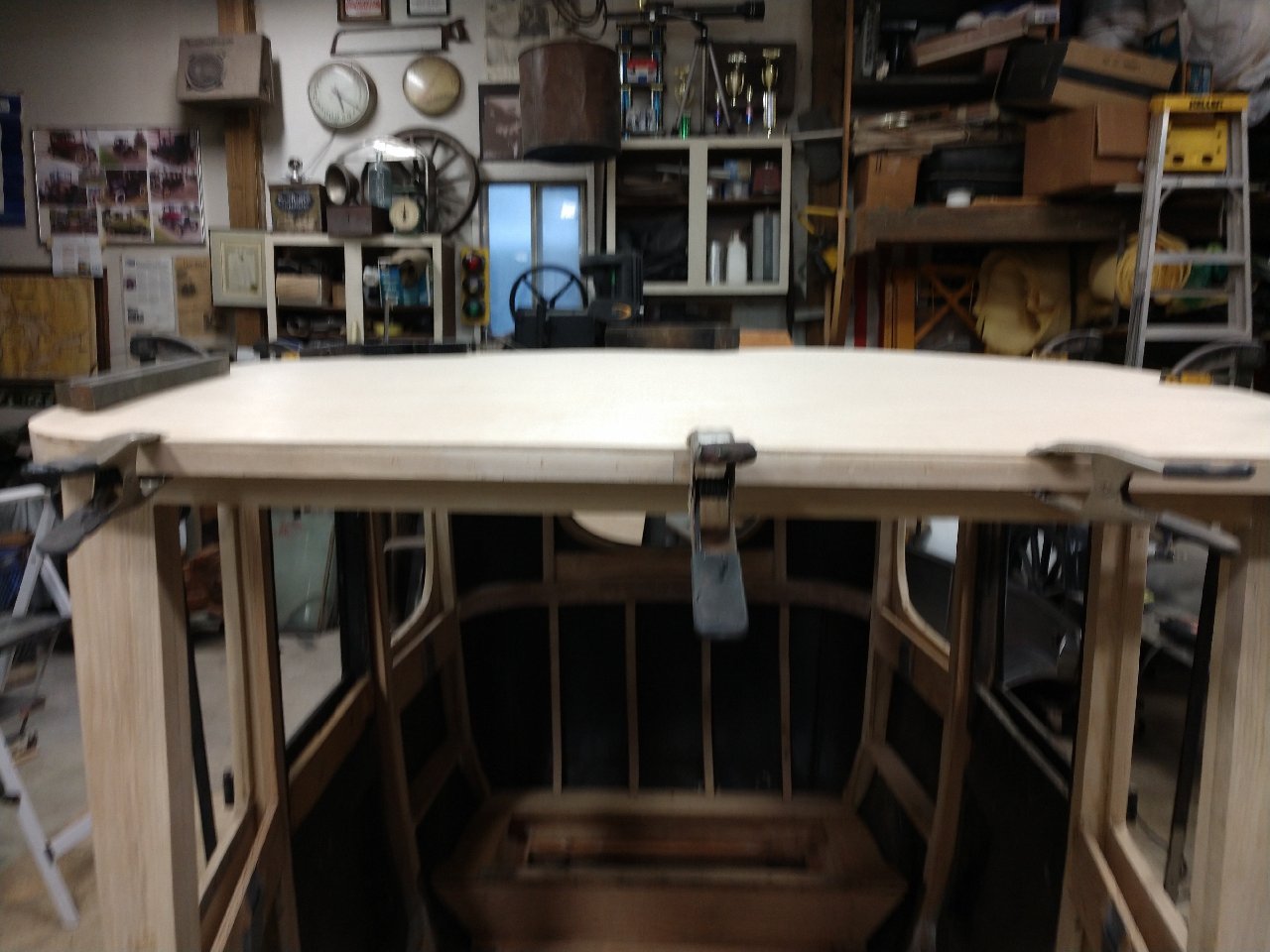 Don, the photo of the centre doors in the factory production line is interesting. The tops on those bodies look much more curved, both from the front to back, and more noticeably from side to side. Those tops have quite a considerable compound curve. Perhaps the original cardboard/masonite material could be massaged to conform to that shape, but I cannot see a sheet of plywood doing the same. The curve front to back may be easily achieved, but the side to side curve not so. If you clamp it down that will add to the load on the rather spindly cross pieces, making them loose the curve cut into them.
