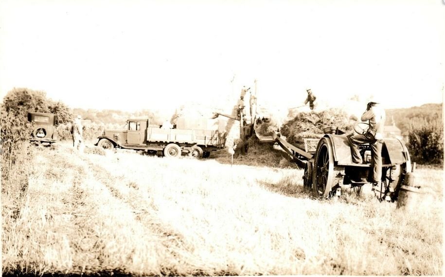 Behing the trucks looks like shocks of possible wheat or oats. Quite a nice photo of harvest time with the trucks, tractor, threshing machine and auto. Really like this one!