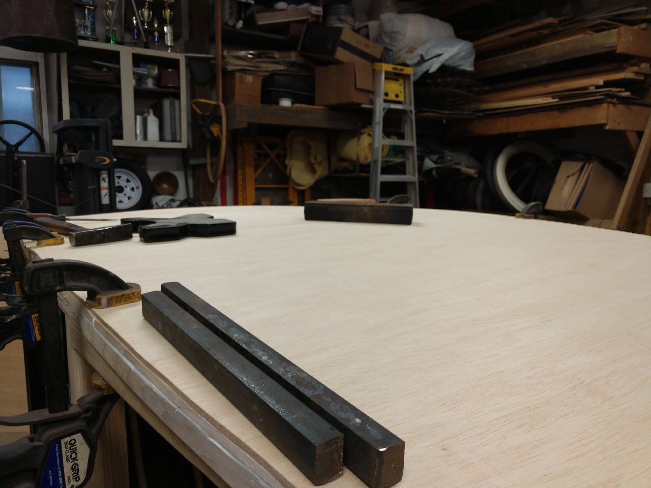 Don, the photo of the centre doors in the factory production line is interesting. The tops on those bodies look much more curved, both from the front to back, and more noticeably from side to side. Those tops have quite a considerable compound curve. Perhaps the original cardboard/masonite material could be massaged to conform to that shape, but I cannot see a sheet of plywood doing the same. The curve front to back may be easily achieved, but the side to side curve not so. If you clamp it down that will add to the load on the rather spindly cross pieces, making them loose the curve cut into them.