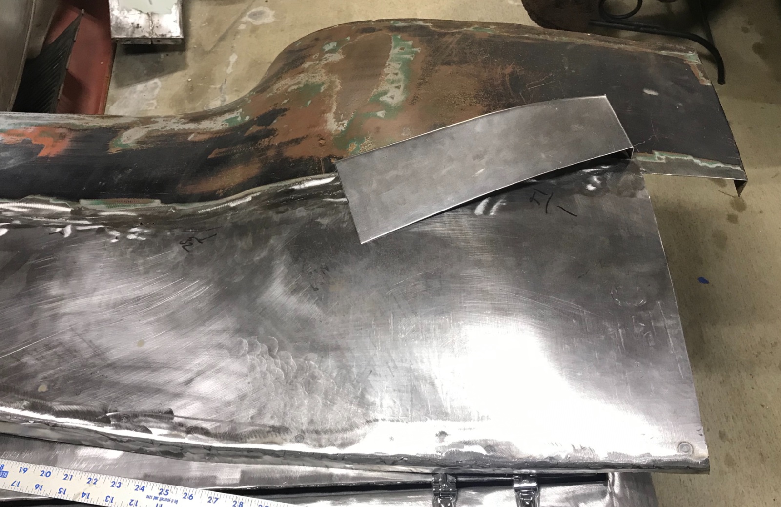 A friend from the Model A club (I have two of those) and I started to make a repair panel for the passenger side quarter panel. He has an English wheel and has some experience. I had assumed that it would be very difficult to make the panel, and it may well be, but we made amazing progress in about three hours of work. I don't have a pic of where we left off, but it is conceivable to me that we could finish it in a couple of sessions. How good it will be remains to be seen, but that will depend upon final finish. It seems doable to me.