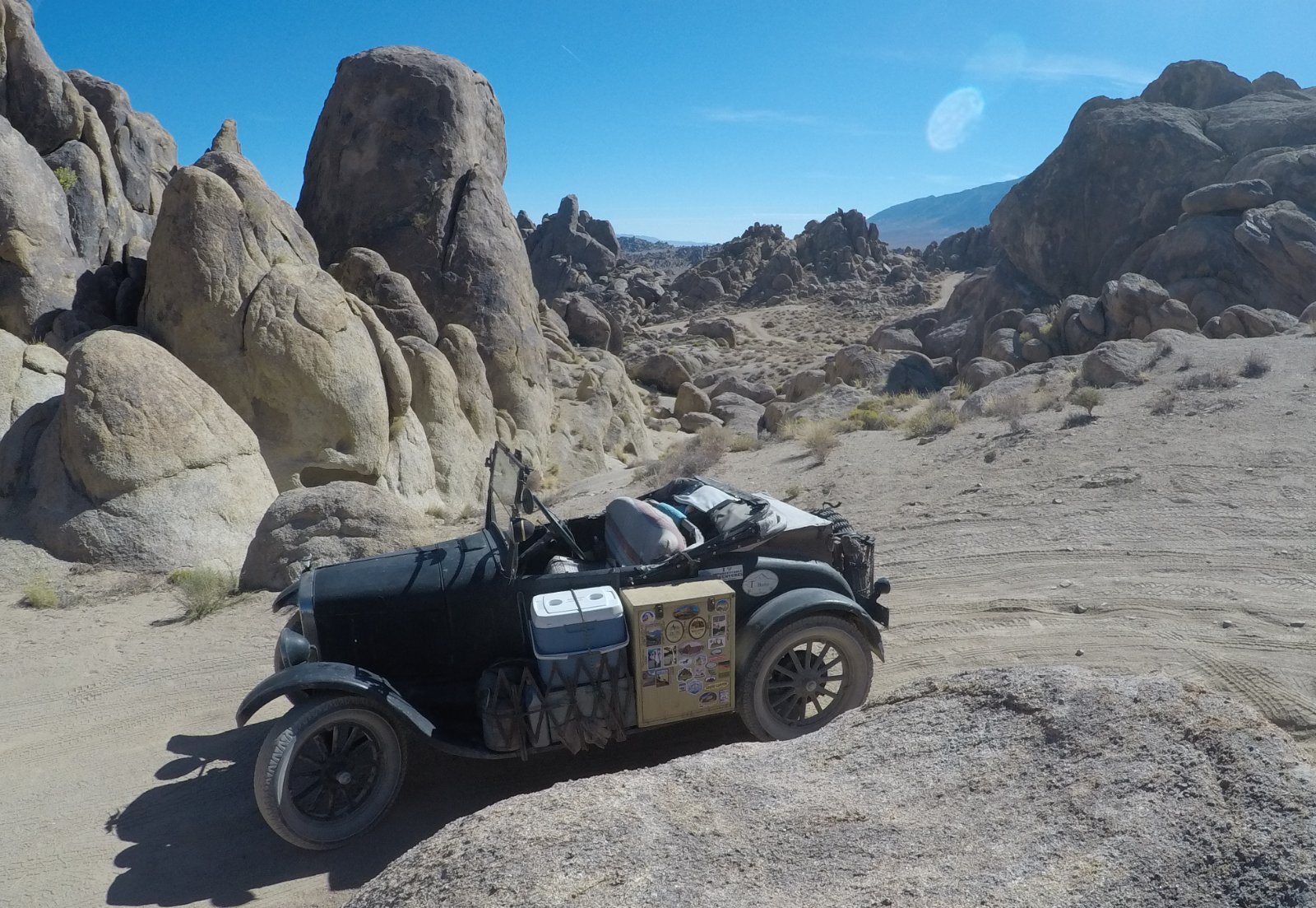 From Death Valley we headed to the Alabama Hills out of Lone Pine California. This is where a lot of the old black and white cowboy movies were shot, I wanted to go here ever since I was a kid, I just didn't know where it was. It is another unique area of rock formations, if you watch enough old movies you even recognize some of the rocks. In town there is a really nice western movie museum, while we were there one of our group ask if an old collage room mate of his that was from Lone Pine still lived in the area, it turns out that he is on the board of directors for the museum and lived about a 1/2 mile away. We went to his place and he was there, they hadn't seen one another in years and it turns out that his grandfather was the person that rented props to the movie people, such as livestock, wagons and ranch locations. We had a very nice visit with him. The following day we went to Manzanar National Historic Site, it is the site of one of the WW 2 Japanese Relocation Centers. I knew a little about these camps but it was very enlightening and humbleing. I recognized a name on the roster, a good friend growing up, there were 24 people there with the same last name, that his family would have been inturned never entered my mind. There is not much left of the camp but it is well worth a visit. When we got back to the Alabama Hills, I spent some time driving around through the rocks playing cowboy, I was the good guy (of course). We didn't spend near enough time here, I will be back.