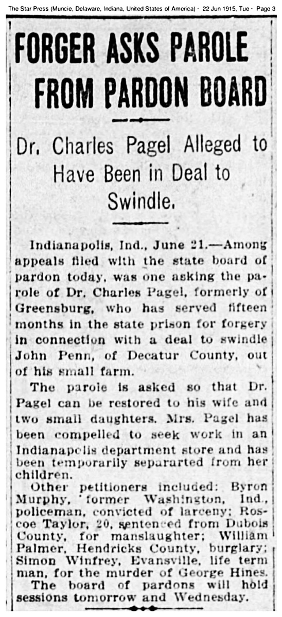 In November of 1913 our good doctor is charged with forgery, involved in a scheme to steal a farm. He's convicted and sent to prison in February, 1914. It doesn't look good for Dr. Pagel: