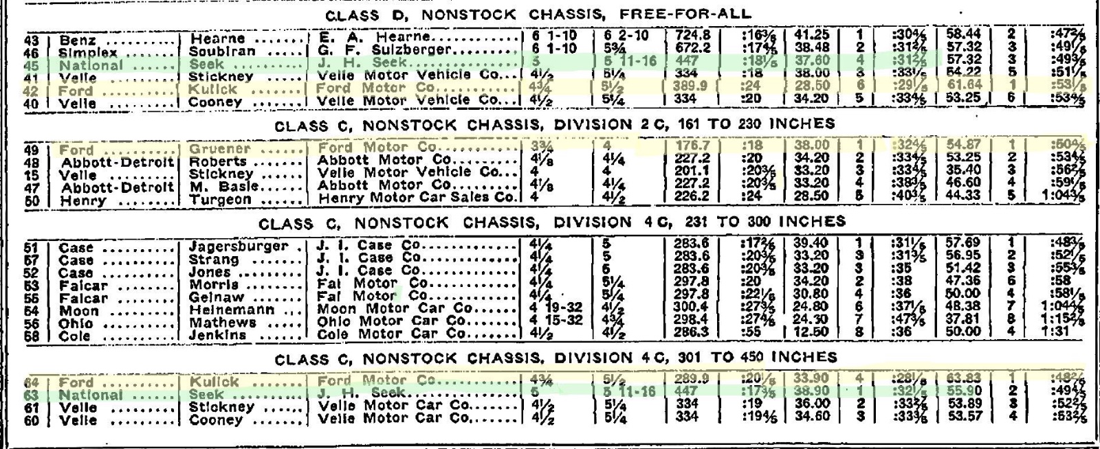 Then, the two Ford Specials, at 228 and 410 cubic inches. Some things to notice include the times (yellow). I also highlighted one National (green). It looks like the organizers had the cars change numbers as they competed in different categories. Both non-stock T’s are significantly faster than the stock T’s shown in the earlier chart. I think the organizers had the same car running in two or more classes (size class and unlimited class) change numbers, so each run would be documented, for the overall Agonquin Hill winner: