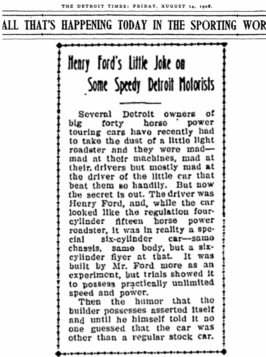 In this case, there’s more. During the summer of 1908, Henry Ford is seen driving a runabout that is overtaking more powerful cars in the Detroit area. First, an article in the July 30 1908 issue of “The Automobile” titled “Henry Ford’s Little Runabout Joke:”