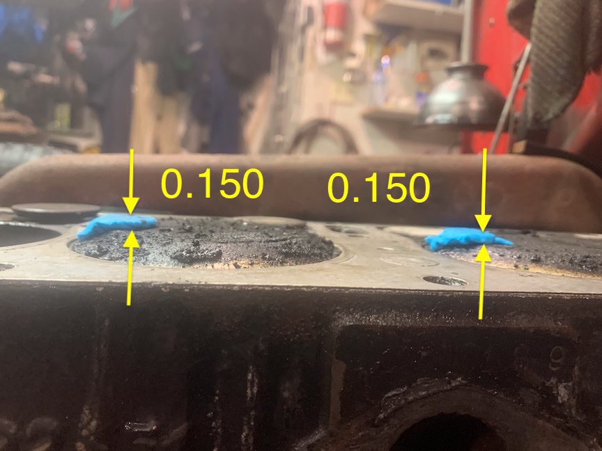 By my estimation, there is currently some 0.150" space between the pistons and the cylinder head "horseshoe" squish area. This is including the head gasket (photos below)