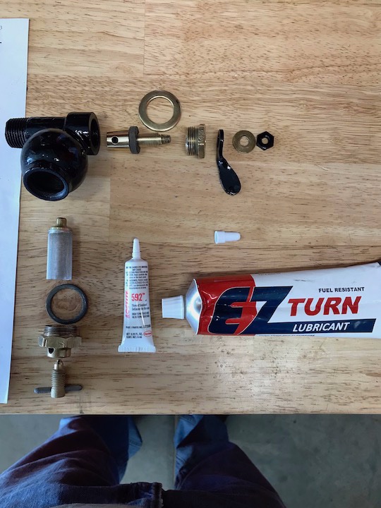 There is a leather seal that goes around the shaft and then the brass fitting compresses it to make it seal. The EZ Turn lube is impervious to gasoline and lubes the brass valve and the leather seal. I used liquid Teflon to seal the pipe threads at the tank.