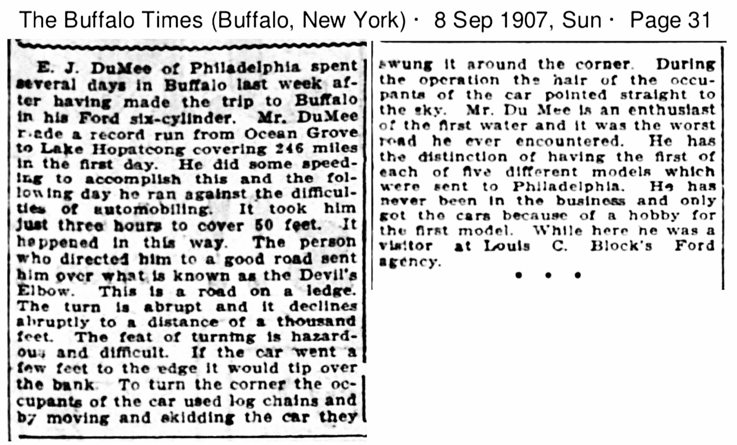On to 1907. This is where I came across du Mee, while searching “Ford six cylinder.” As of September, 1907, E. J. DuMee and wife are touring through New York State and Pennsylvania: