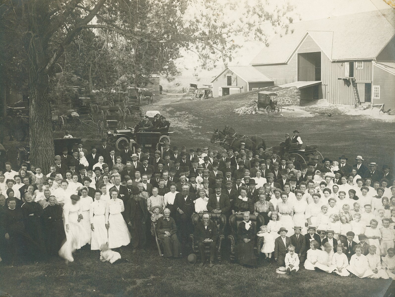 This photo was taken near Baltic, SD at the 50th wedding anniversary of my great great grandfather's brother. Any thoughts on the make of the car that is sideways in the background? Leather license plate visible on a rear facing car indicates pre-1913 in South Dakota.