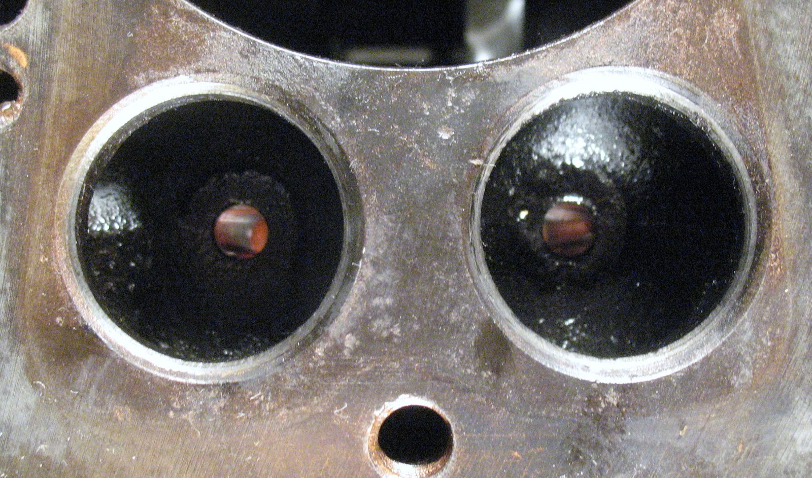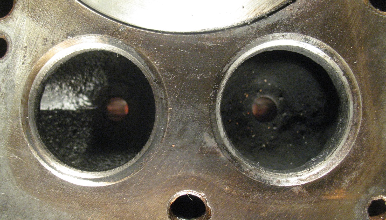 OK, I don't know if the pictures are good enough to show anything, but here are the valve seats. There are two shots at each cylinder, one from straight above and one from the side.
