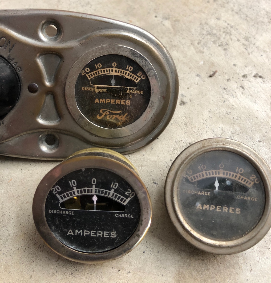 Here are 12 different "Ford" script ammeters that were used on 1919-25 Model T''s that had generators.. The 6 on the left have the "Ford" behind the needle, and the 6 on the right have the "Ford" below the needle. The ammeter on the lower right is a 1926-27 ammeter with the adapter ring that Ford provided so that it could be used on the 1919-25 cars.