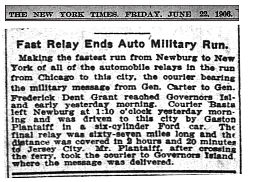 The article tells us the Ford carried the courrier the last leg of the journey, from Newburgh to Governor’s Island, New York. We know the back of the first photo reads “rough road between Newburg(h) and Kingston.” I also knew the leg of the relay before the Fords took over was from Kingston to Newburgh, and guess who ran that leg?