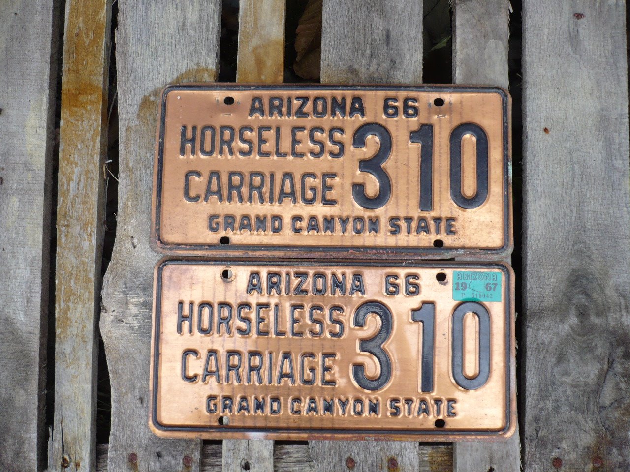 Arizona issued solid copper plates in 1932, 1933, and 1934. There were several years that plates were painted a copper color (1916, 1925, 1927, 1928, 1936, etc.). Today, Arizona issues solid copper plates for Horseless Carriage, Classic and Historical vehicles. The 1915 plate on my coupelet is only the second year that Arizona issued a license plate.