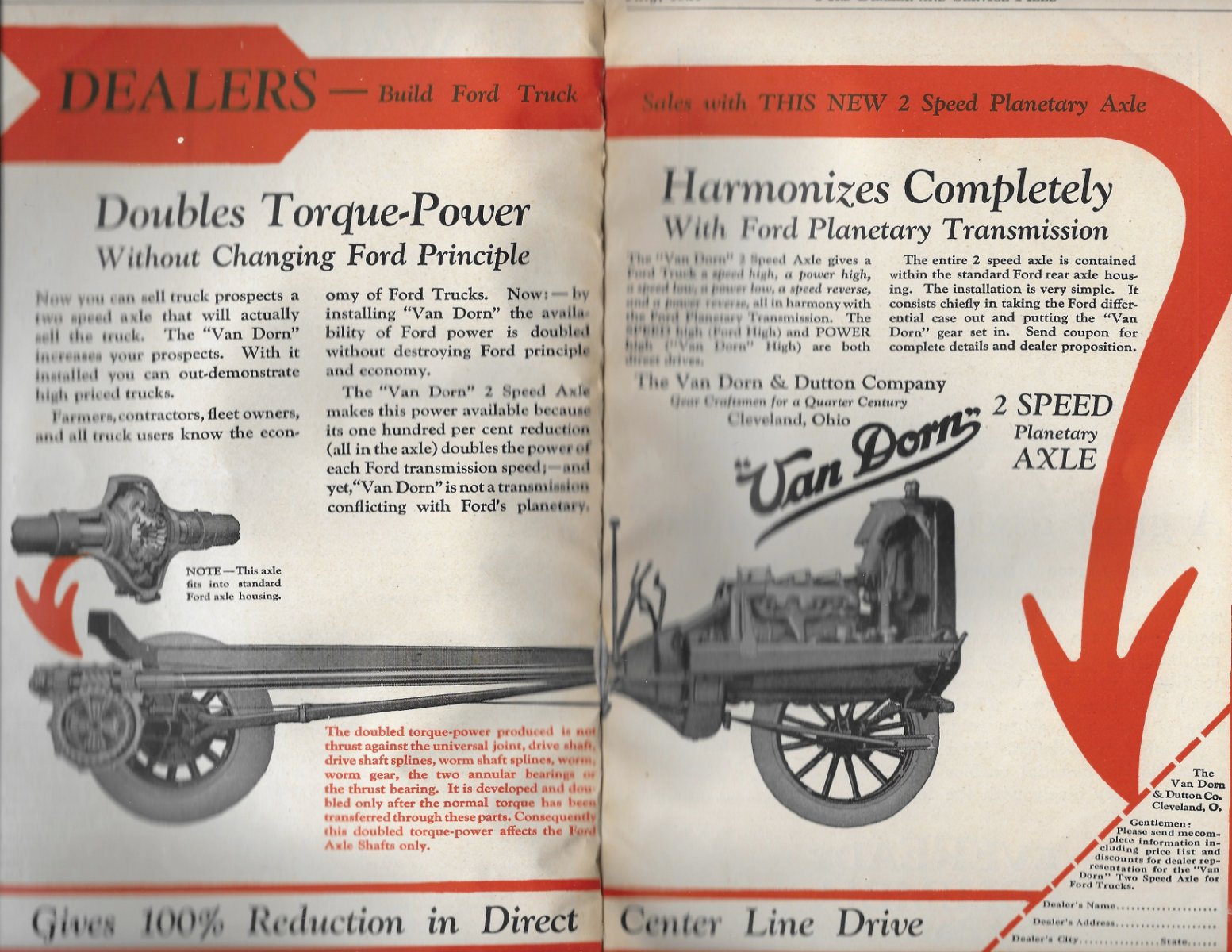 While looking through my Ford Owner and dealer magazines for more Gould ads I found these for the Van Dorn two speed axle for The Model TTs. This one is interesting in that their 2-speed unit fits inside the factory rear axle housings. This is another one that I've never heard of before and never seen. These were advertised from July of '26 until at least June of '27. Could be longer but the June issue is the latest that I have. They shrank that final ad down to a black and white, quarter page ad so I'm guessing they were running out of funds. It's hard to imagine that the company advertised for more that a year without producing any axles. So, same question as my Gould axle post. Has anyone ever seen one, owned one or know anything about them?