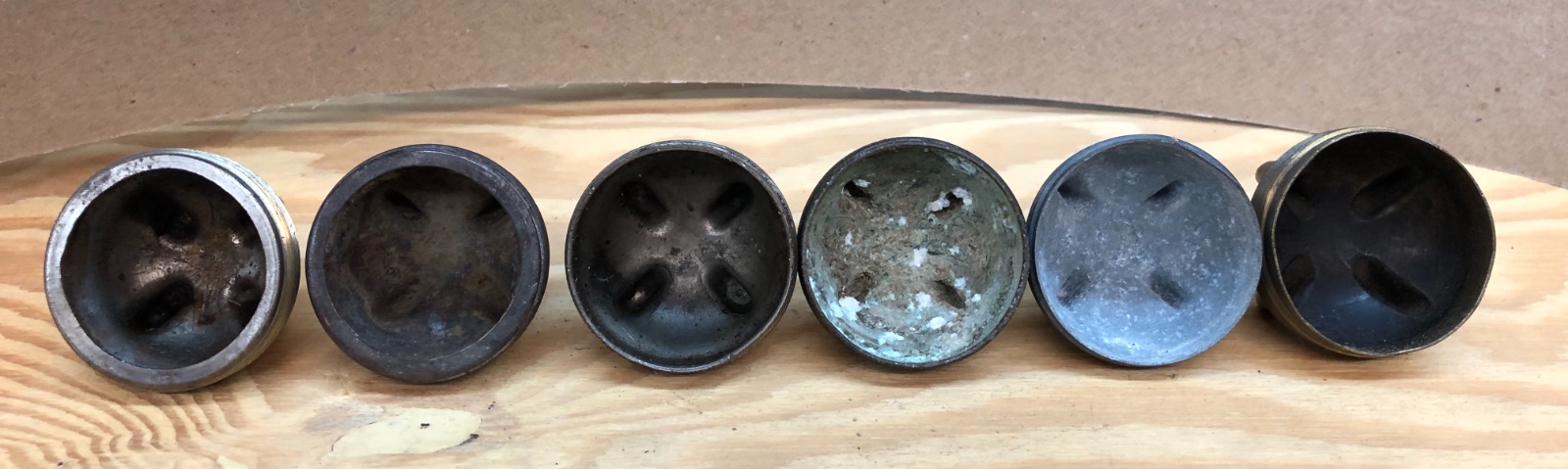 These are regular caps to me, and are made similar, but #1 on the right is heavy brass, and #2 on the right is lightweight alum or zinc ?cast, likely made in the '18 period, as some hub caps then were made of the same material too. The ones on the far left have the 'rim' under, these exhibit a more machined rim. Seems the 'rounded or rolled over' under rim of the cap shown in posts above is likely the '26 Improved version. Think these on the right end in my picture are maybe from '25 period. Who knows, need to do more investigation, if what Bruce found is the only change order info, don't know.