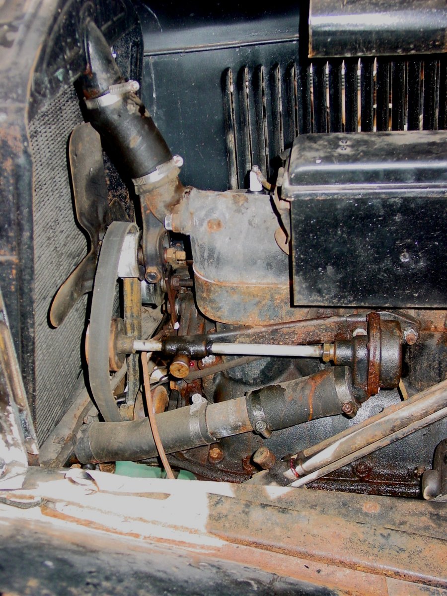 Couple of observations, the spark advance rod to the timer is placed over that large hose, unlike stock, you may have to change that out to get good timing. The carb has extra rod to it, that is linkage to a foot feed accelerator on the floorboard. The radiator is older aftermarket. Lastly, the radiator outlet with fan pulley is the early 1926 version, with adj. bolt below, Ford changed that to new style with fan shaft and eccentric to provide belt adjustment.
