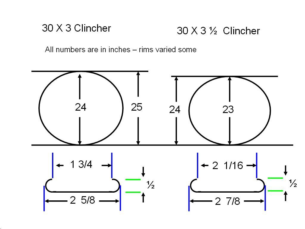 My wheels are clincher 3-1/2" x 30, not balloon. I guess I could make some kind of fixture to measure the felloe inside diameter that avoids the hub. The trouble is with the wheel assembled, I cannot get a straight measurement across the wheel accurate with in 1/16". I have a friend who has a press and has re-spoked wheels on several of his cars. Do I need to take the wheels apart in order to measure the fellows? If I'm going to re-spoke, I guess that it doesn't matter. Seems like shipping four wheels somewhere would be costly.