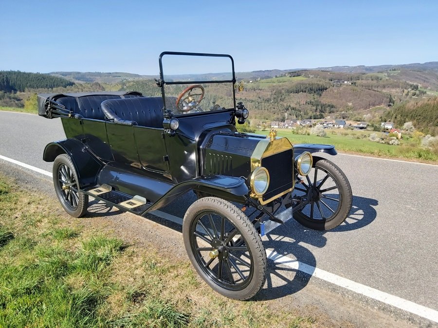 Well! It's been since February that I last drove one of my 3 T's It's been so long I almost forgot how! Since it has been so long I decided to start on crank and then let the generator charge up the battery as I drove on magneto. Well it started right up and I was almost ready to get in and drive when it stopped. I had forgotten to turn on the gas. So then I turned on the gas and it started running out the carburetor. The float had dropped lower than it is when I drive it. So I tapped on the carburetor and it stopped leaking. I got it running again and started on my 6 mile round trip to the Pharmacy. I had to go down a hill and couldn't get it into Ruckstell so I had to pump the brake. At least I have Rocky Mountain brakes. I realized that I must shift to Ruckstell while the throttle is advanced and I was trying to shift with the brake on! Then I almost used the spark advance lever for a turn signal! I have to make hand signals with this car. I got to the Pharmacy and met some friends there. They were in the parking lot and since I had crank started the car, I left the engine running for about 5 minutes. When I backed out of the parking space, I started forward and couldn't get it into high gear! Then I realized the parking brake lever was in neutral while backing out and was still in that position. No other problems while driving home. The generator was not charging so when I got home I flashed the generator and it started charging. It had sat so long it lost it's residual magnetism. Yes I did turn off the gas when I got home. I was quite rushed on the way down because I had planned to met my friends there. That is why I made so many errors. At least now 5 hours later I still remember what happened. Just some "Senior" moments.