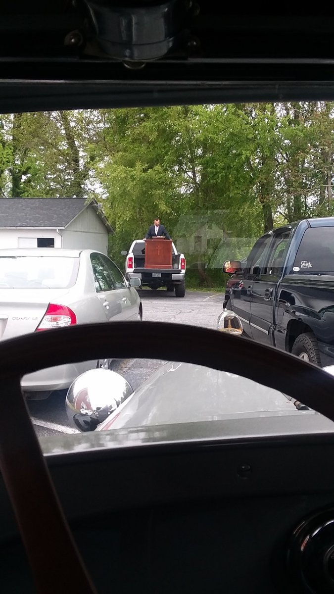 My reply might be a little OT but we went to drive-in church last Sunday, in our Model A. Here's a pic thru the windshield of the preacher in the bed of a truck. He was wearing a mic.