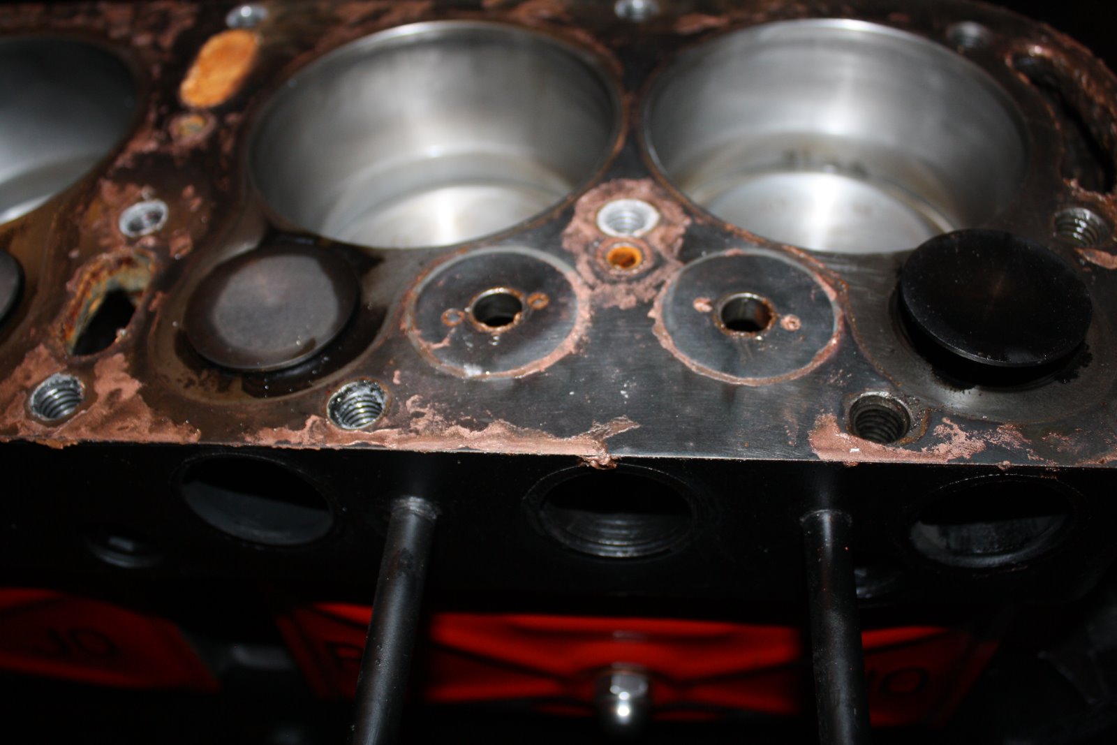 Well I got the radiator all cleaned out, pressure tested and installed. No leaks so it was time for a longer test run. The engine started easily, settled down to a nice idle, and things were really looking good. Then all hell broke loose. I noticed an oil leak near the passenger side crankcase arm. It is leaking between the two hogs head bolts at the front and rear of the arm. Not a little leak but a stream the size of a pencil lead. Not a drip drip type of thing but a steady stream. Then I noticed oil leaking out the threads of #1 spark plug. And about that time The front two head bolts started bubbling water... And then the %^$#@ rebuilt starter (I will not say what vendor it came from other than it was not Lang's) started pouring oil out the front of the starter. So it looks like I have a blown head gasket, and I will have to remove the engine to remove the crankcase and see what's wrong with the gasket ??. The crankcase was straightened on a pan jig so I do not have a clue how I could have that bad of a leak. Im not really sure if the oil at #1 plug is oil or oily water. I did every precaution when installing the head gasket and used guide pins to lower the head into place, so that is another "I do not have a clue what could have went wrong.
