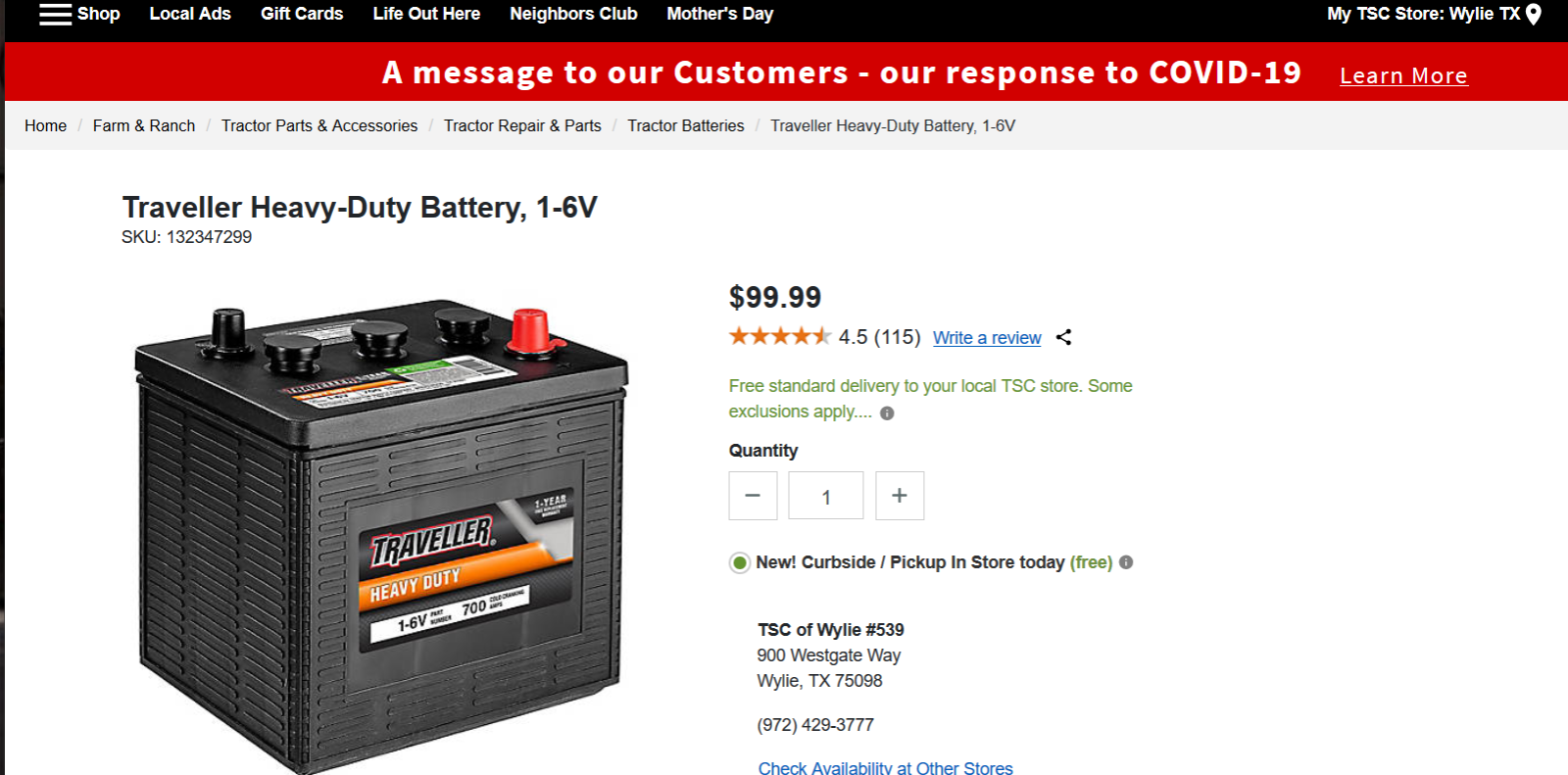 Thanks for all of the responses. I did find several batteries "on the shelf" at Tractor Supply stores near me but they were at least 6 months old already. Others said their batteries do not even have a manufacturing date on them. Walmart will not let you check inventory over the phone and several Walmart auto centers are still closed in our area. Several stores mentioned in posts above show them in inventory but do not actually have any in stock. Others said they are on order but they have no way of knowing when they will show up.