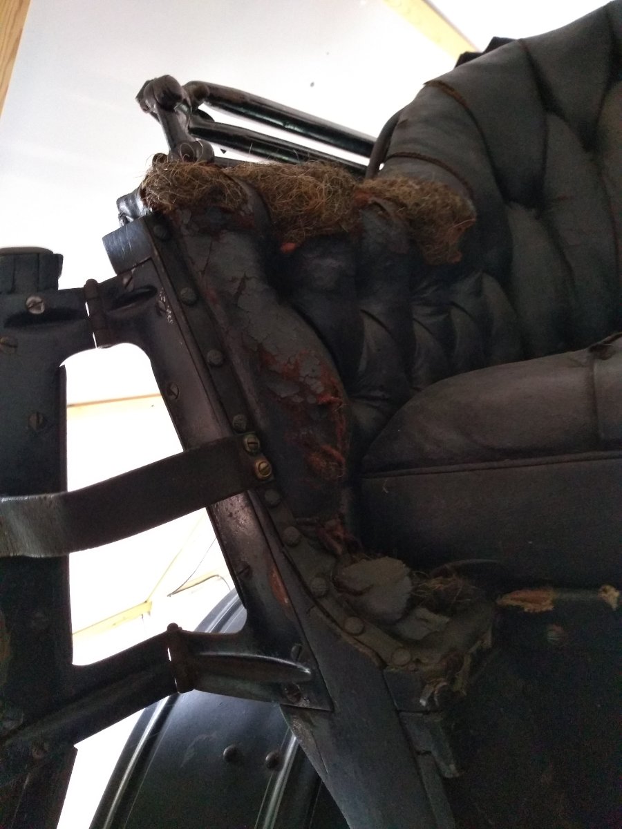Many thanks for these recommendations and these photos. Shown is the upholstery arrangement that I have (many thanks to Elizabeth Estep and her shop). Original footman loop was located mid way down the top portion of the panel, directly on top of the gimp trim. An added note: Footman loops appear to be originals, where both the loop brackets and the round head screws have surviving brass plating. Plan is to replicate the plain Black strap as seen per Jem's example, where this will have one brass rivet attaching the strap to the loop, and then secured to the hinge post with(2) oval top brass screws with cup washers, as per Tony's photo.