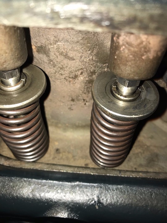 So now that I have adjustable lifters I have to grind off about 1/16th of an inch of the valve stem. You can see how much it sticks out of the seat. The cam lobe is on the low side and the adjustment is run down but also allowing for some adjustment.