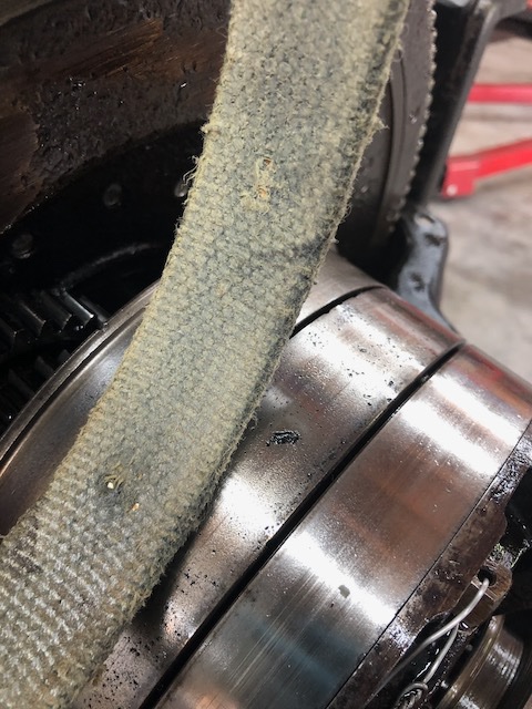 Low speed, ah, some fraying on the edge....near the brake drum. The low drum is poor too, has some pitting, one pit still had a fray of Kevlar!.