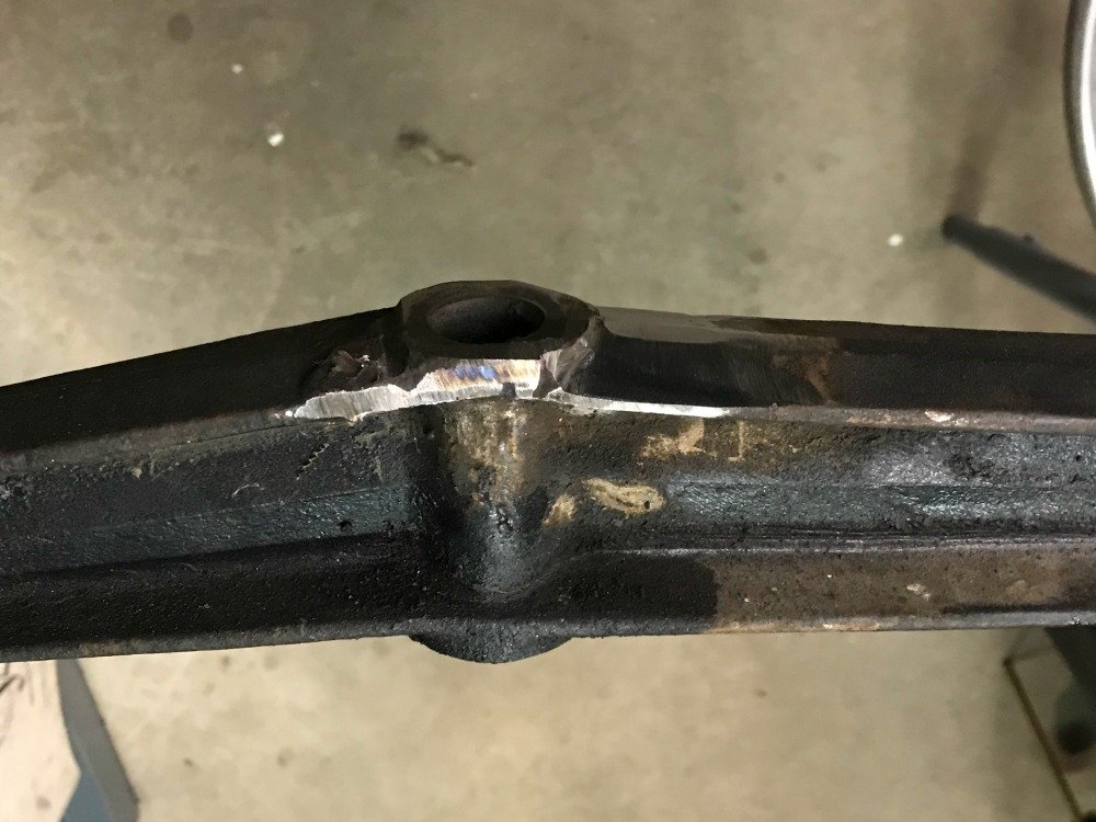 I did discover why the spring perch was welded to the axle. The threaded shank on the perch was sheared clean off! The only thing holding the shank in in was the rust. What really made me shiver was the fact that a few light taps with the hammer, and the shank came out! So virtually NOTHING was holding the home made wishbone helper in! Something told me to deal with this front axle issue sooner than later. Boy am I glad I did! The welds are "rough" ground off and thankfully the original axle will be easily saved, thanks to crappy welds that didn't stick to it too bad.