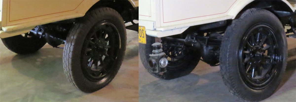 The ambulances are on White Motor Co. chassis. This 1920 White delivery shows the rear axle and truss rod as well as the hub cap. While many different makes supplied ambulances for the war hundreds of Whites were used. The wheel and tire size is different.