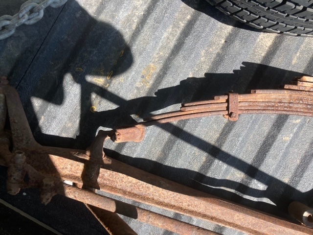 The front spring is a messed up put-together super heavy duty (I have a similar one in my pile). You would need to take it apart to see how many leaves are straight and decent enough to be used. I see some that are broken halves (must be drilled for the center bolt). There may or may not be enough good pieces to make one good spring. Otherwise, it is good parts to repair another spring. The broken halves may also be useful. The ends can be cleaned up on a good grinder to make shorter top leaves.